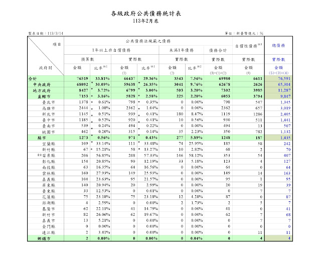 截至113年2月底止各級政府公共債務統計表